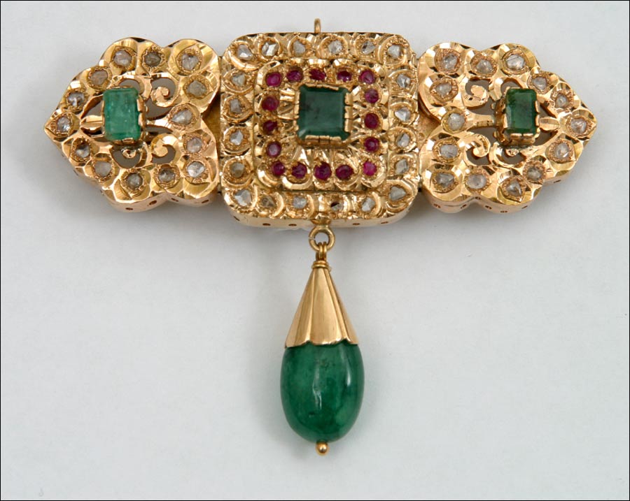 Broche marocaine en or jaune. Avec trois émeraudes rectangulaires en cabochon et se terminant par une pendeloque agrémentée d'une émeraude en forme de goutte.